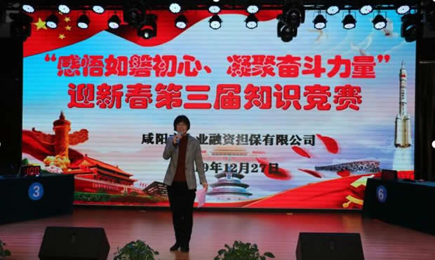 12月27日,在辭舊迎新、迎春接福之際,咸陽市企業融資擔保有限公司組織開展了“感悟如磐初心、凝聚奮斗力量”迎新春綜合知識競賽,典當公司全體干部職工參加了答題競賽。本次知識競賽邀請了市國資委、市金融辦、市中小企業辦等金融機構相關領導參加。