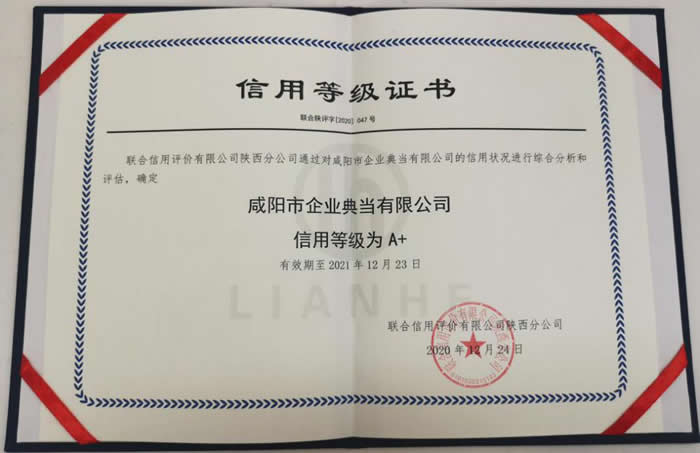 新年伊始,萬象更新,喜訊傳來。經“中國誠信信用管理股份有限公司陜西分公司信用評級委員會”審定,授予我公司2020年度企業資信等級為A+級并頒發資信等級證書。
